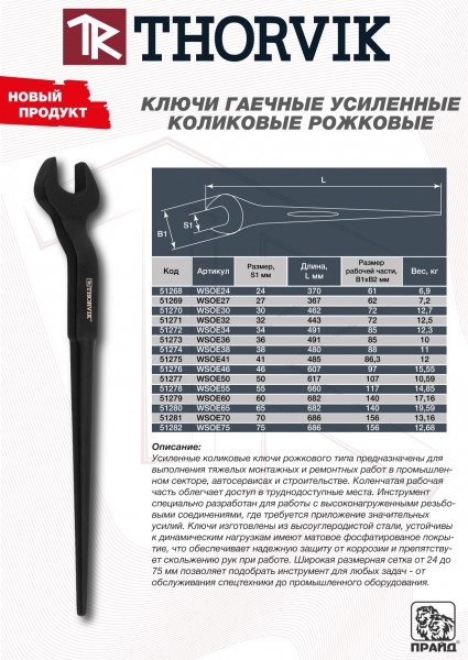 WSOE34 Ключ гаечный усиленный коликовый рожковый, 34 мм Thorvik