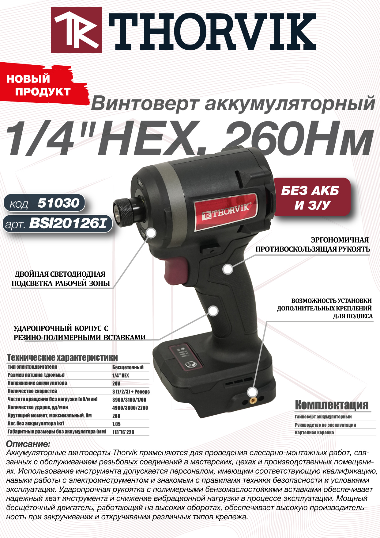 BSI20126I Винтоверт аккумуляторный, 20В, 260 Нм, (без АКБ и З/У) Thorvik
