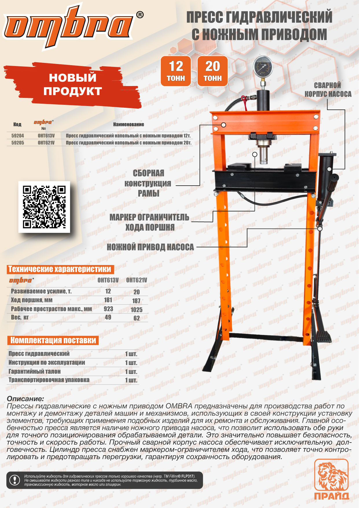 Прессы гидравлические с ножным приводом OMBRA предназначены для производства работ по монтажу и демонтажу деталей машин и механизмов, использующих в своей конструкции установку элементов, требующих применения подобных изделий для их ремонта и обслуживания. Главной особенностью пресса является наличие ножного привода насоса, что позволит использовать обе руки для точного позиционирования обрабатываемой детали. Это значительно повышает безопасность, точность и скорость работы. Прочный сварной корпус насоса обеспечивает исключительную долговечность. Цилиндр пресса снабжен маркером-ограничителем хода, что позволяет точно контролировать и предотвращать перегрузки, гарантируя сохранность оборудования.