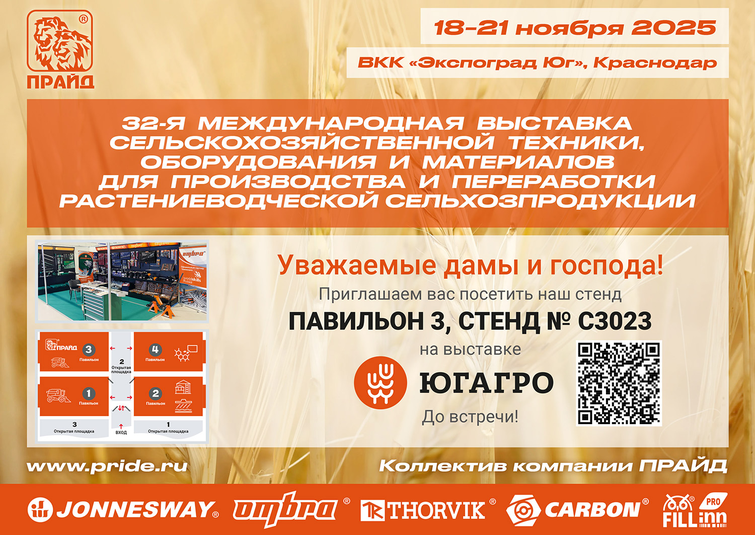 ПРАЙД примет участие в крупнейшей 32-й Международной выставке сельскохозяйственной техники, оборудования и материалов для производства и переработки растениеводческой сельхозпродукции "ЮГАГРО", которая пройдет с 18 по 21 ноября 2025 года в выставочно-конгрессном комплексе "Экспоград Юг"